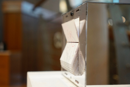 4 split-flap displays (laser-cut acrylic, servo motor, die-cut PVC flaps, arduino and code), 5-channel sound, FM radios, dimensions variable.